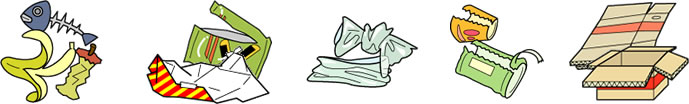 食品残渣、紙ゴミ、汚れたビニール類、包装ビニール類、段ボール