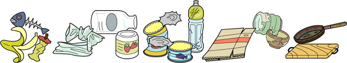 厨芥類(生ゴミ)、汚れたビニール類、ビン類、缶類、ペットボトル類、